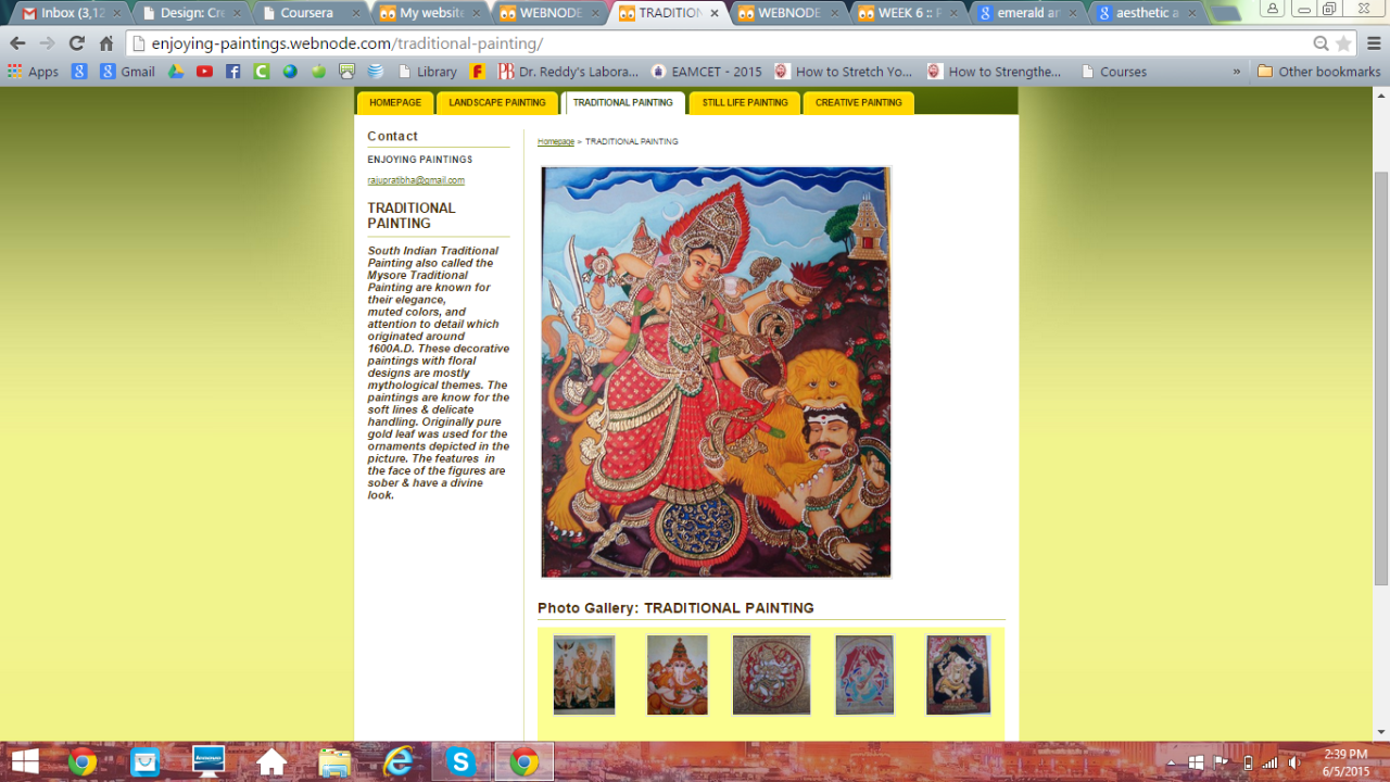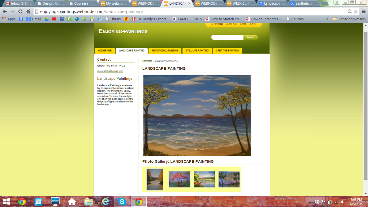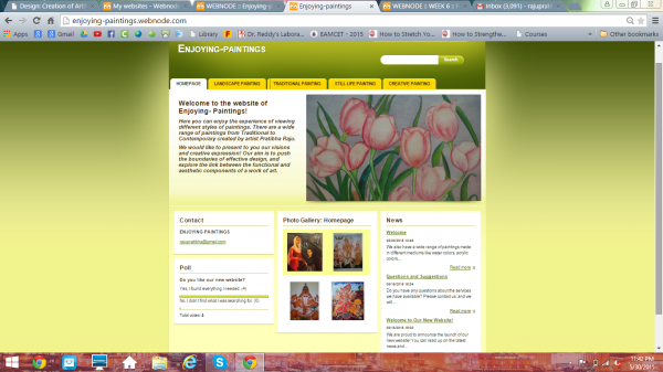 It has been a wonderful experience during the past few weeks of the course. I have got a deeper understanding on Design. Since I always wanted to create a website for my paintings, through this course I learnt to create a website using Webnode. I used the same webnode to create my own website on paintings. As I am artist I always wanted to display my paintings on a website.